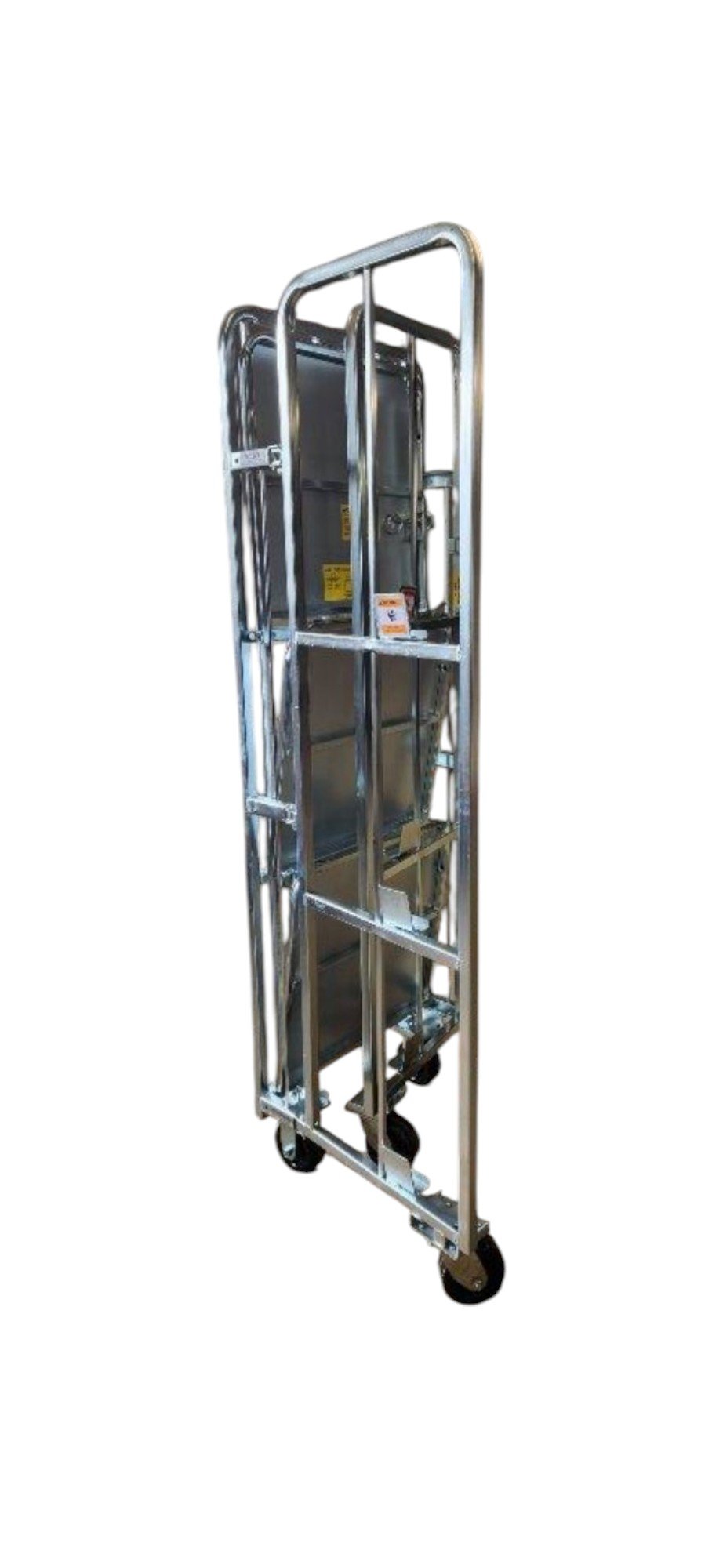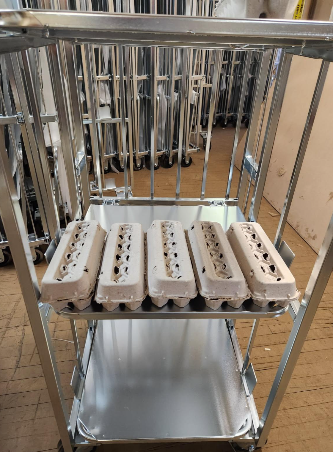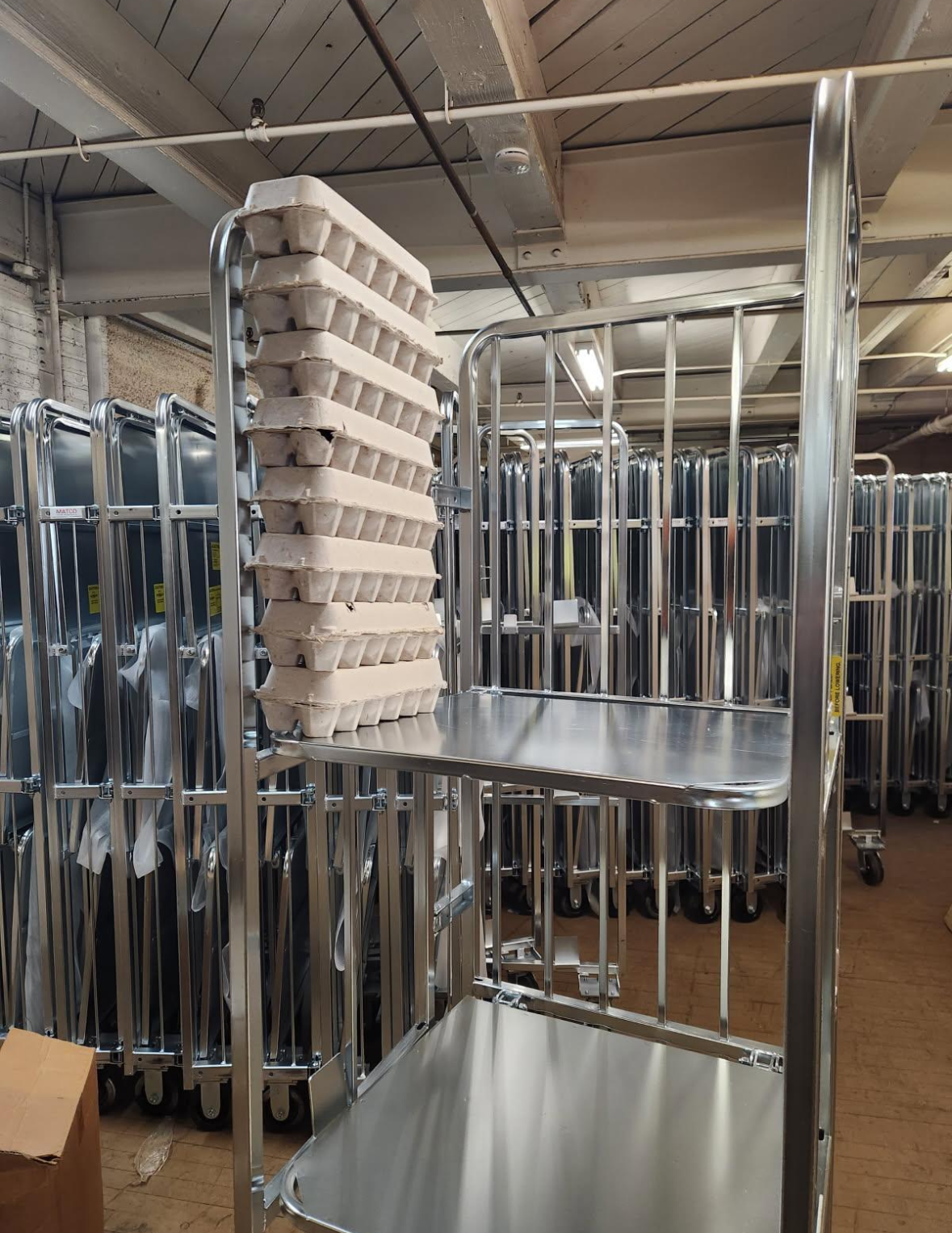 The 220 Dozen Egg Display and Distribution Cart from Matco is a high-capacity, heavy-duty cart built for efficient transport and merchandising. Its sturdy construction and sloped shelving make it ideal for securely displaying and moving fragile goods like eggs or other lightweight products. The foldable design allows for easy storage when not in use, making it a space-saving option for busy retail or agricultural environments. With durable materials and a professional finish, this cart is perfect for farms, markets, grocery stores, and distribution centers alike.